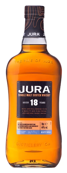 ZICHT/KLEUR Vol goud. GEUR Aroma van toffee en kaneel. SMAAK Vanille, karamel en tropisch fruit die in de smaak worden versterkt door smaken van bramen, bosbessen, sinaasappel, chocolade en koffie. AFDRONK Subtiele rooktonen bij de finish. COCKTAIL Heerlijk om puur van te genieten. BIJZONDERHEDEN Een karakteristieke Jura whisky, met een finish op rode wijnvaten. Men zegt dat tijd niet te vangen is, maar dat geldt niet op Jura. Deze whisky heeft 18 jaar lang mogen rusten op American white oak ex-bourbon vaten en is vervolgens verreikt in Premier Grand Cru Classé Bordeaux vaten. A masterpiece created by time.