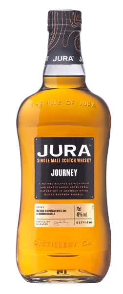 ZICHT/KLEUR Amber goud. GEUR Vanille, kruiden en citrus. SMAAK Fris en volle smaak met tonen kaneel, frisse peer, toffee, pecannoten en een subtiele rooksmaak. AFDRONK Subtiele rooktonen bij de finish. CULINAIR Rundvlees is een goede begeleider van deze whisky. BIJZONDERHEDEN Jura Journey Scotch Single Malt is jouw kans om het eiland Jura te ervaren. Via jouw glas word je meegenomen op een reis vol smaak. Zoete tonen van toffee worden aangevuld met de karakteristieke zachte, licht rokerige toon die je in iedere whisky van Jura terug vindt. Deze whisky heeft gelagerd op American white oak ex-bourbon vaten.